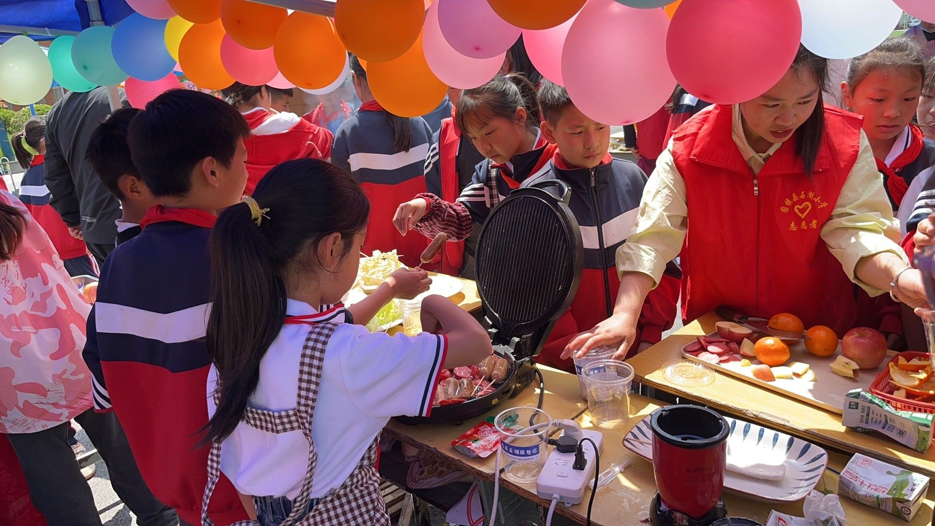 活動當天,學校邀請了非遺手藝傳承人和部分學生家長擔任此次活動的嘉賓和評委。操場上,學生們在老師和家長的指導幫助下,集思廣益,各施所長,各班級精心布置了美食攤位。同學們有的在現場化身小廚師,或烤或煮,大展身手,將食材變成色香味俱全的佳肴;有的成為小貨郎,穿街走巷,招攬來客,將一道道美食送到大家面前。忙碌的身影,燦爛的笑臉,一時間,鍋碗瓢盆聲、叫好叫賣聲響成一片。