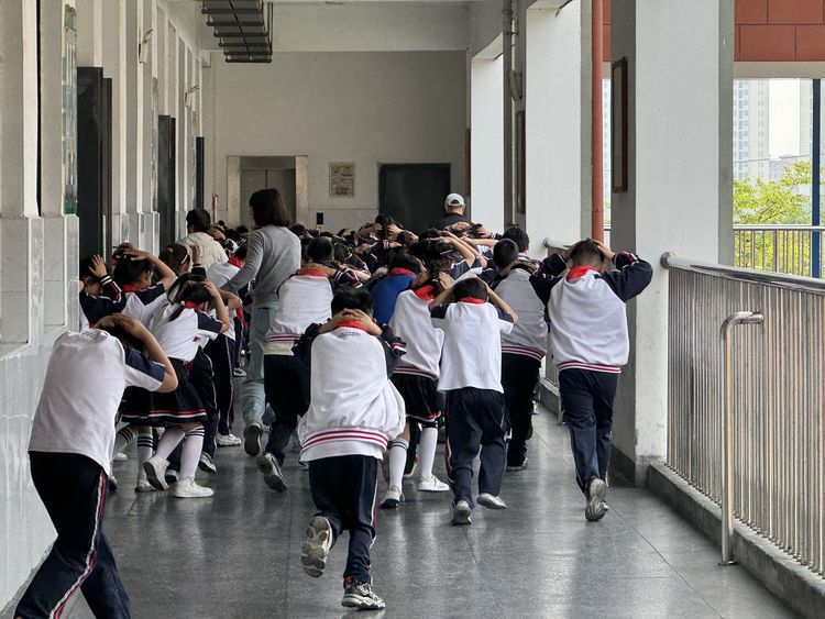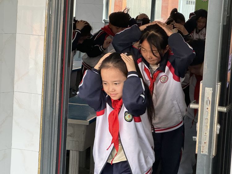 實戰演練 以練筑防。隨著警報聲響起,防震演練正式開始。聽到疏散指令后,各班學生在老師的指揮下低頭彎腰、雙手護頭,安全、有序、迅速地按規定路線撤離。撤離過程中,全體學生沉著冷靜、服從指揮,快速有序到達指定位置。