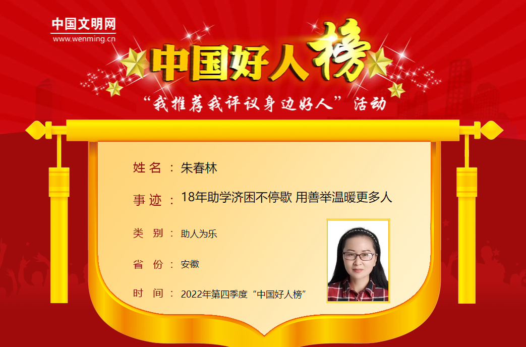 朱春林常說(shuō):“我有一抹春,愿染萬(wàn)層林。”她正是用自己真切的善行義舉,傳承弘揚(yáng)了中華民族助人為樂(lè)的傳統(tǒng)美德,鑄就了新時(shí)代的凡人贊歌!