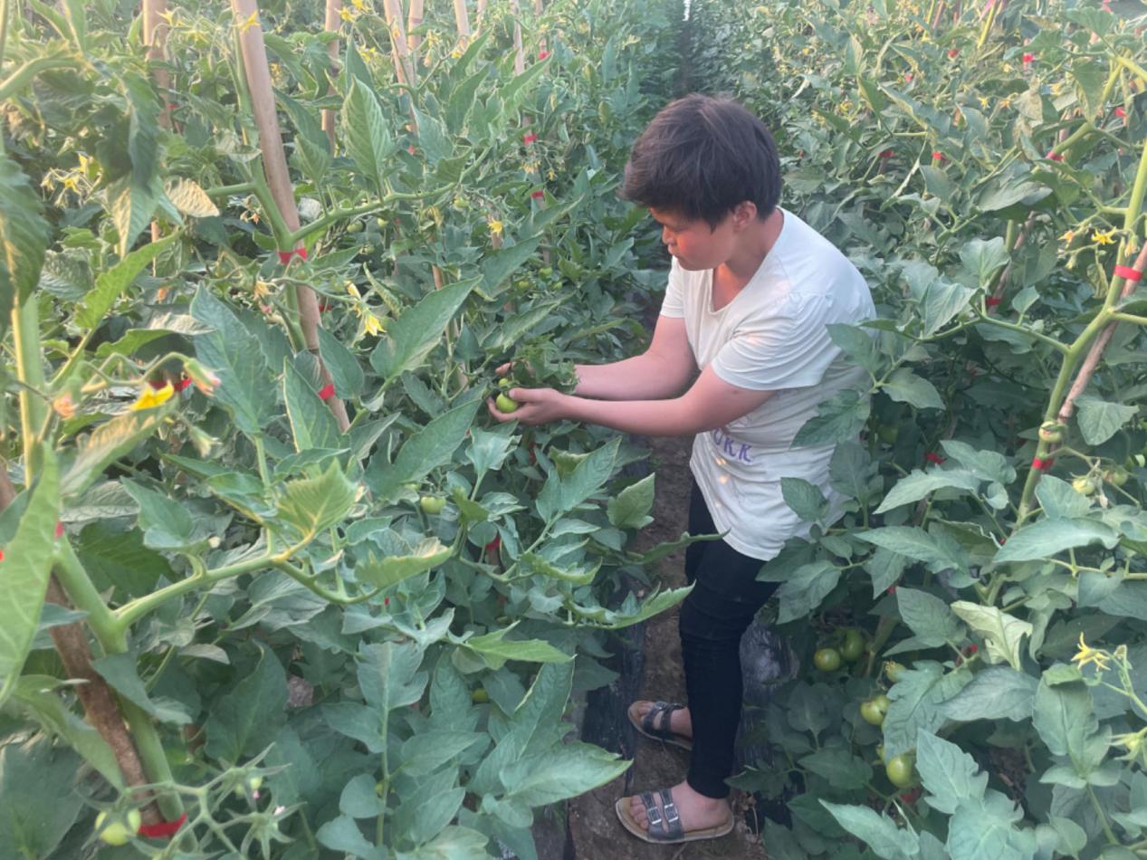 20歲楊雨是一名智力殘疾人,在母親周娥陪伴下,參與西紅柿種植。“榴城悠然家庭農場負責人經常鼓勵大家,身體殘疾,但心不能殘疾。”周娥感激道。