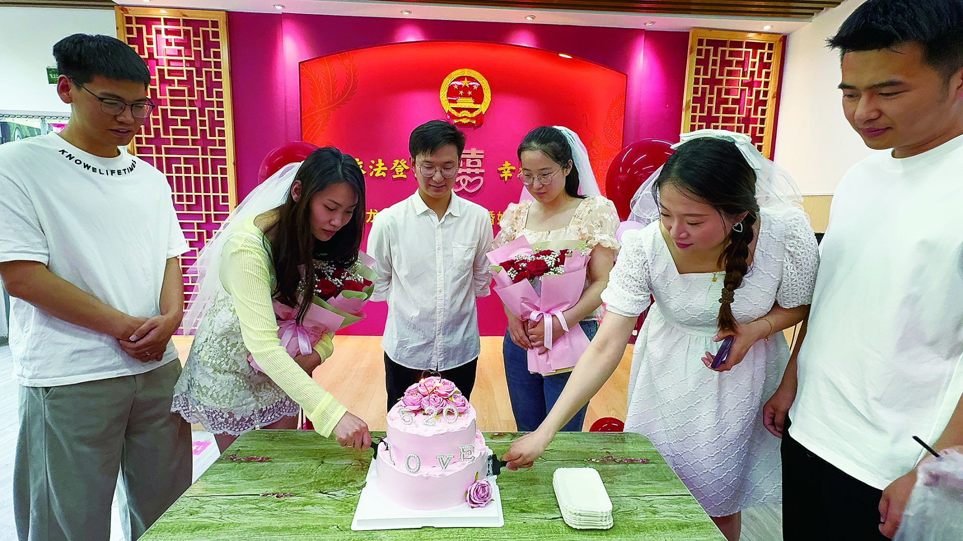 圖為“520”當日,龍子湖區婚姻登記處舉辦集體頒證活動,為新人們慶祝。