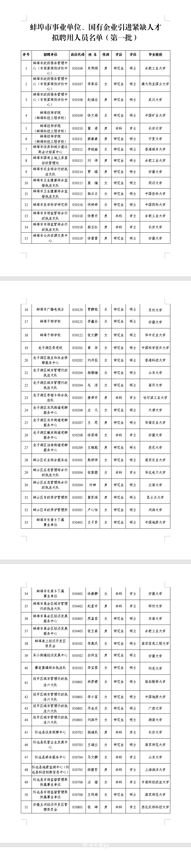 蚌埠市事業單位、國有企業引進緊缺人才擬聘用人員名單公示(第一批)