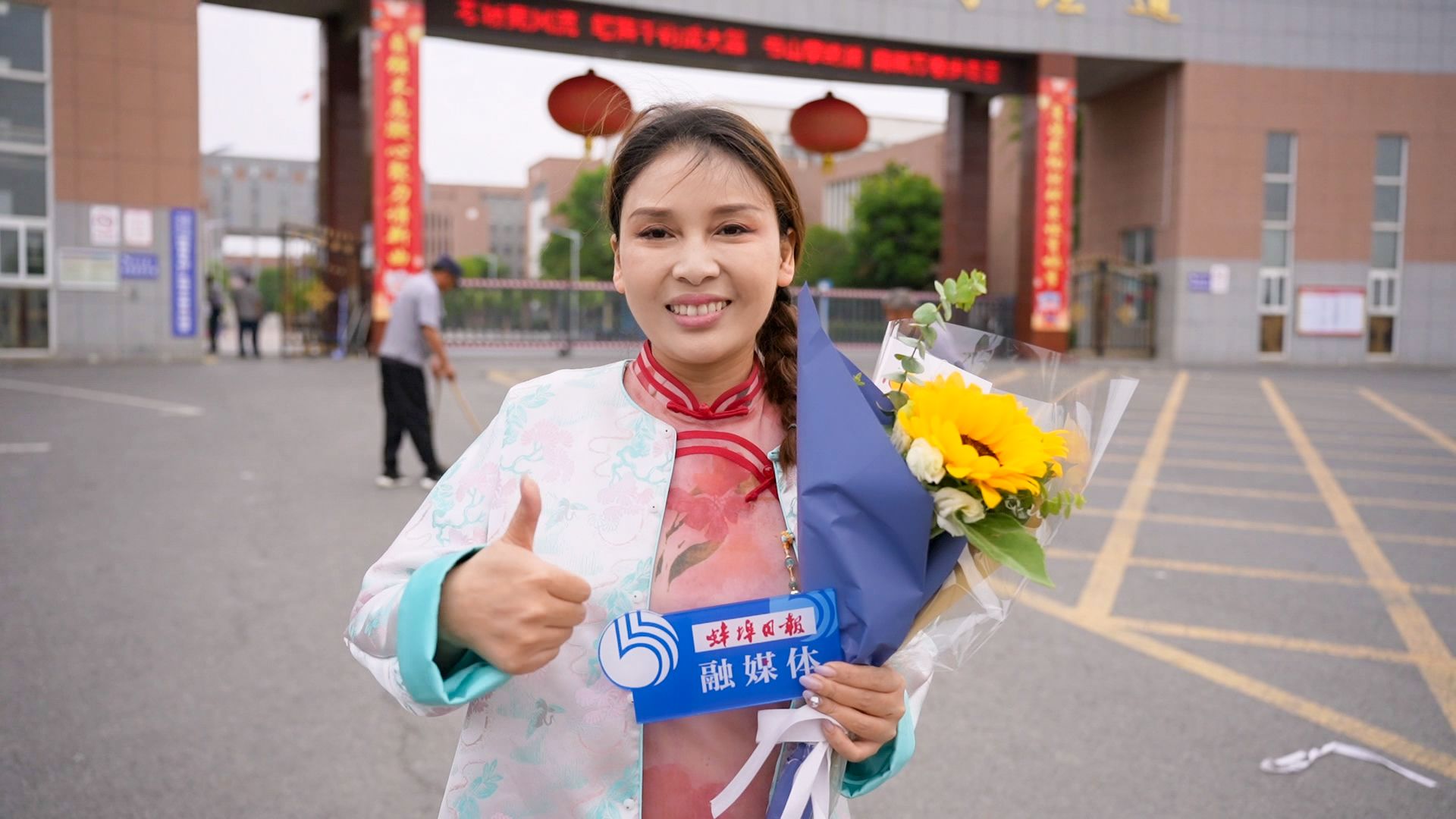 送考結束,李陜陜捧著事先準備好的鮮花前往考點門外,再次等待兒子的出現。