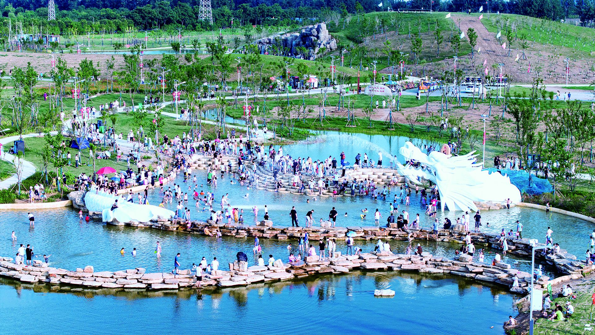 據了解,該工程通過將大學城西側城市“垃圾場”改造成湖濱生態修復和濱岸清水暢流帶,開展岸線生態整治12.6公里,連通水系6.87公里,整治土地1131畝,耕地種植339畝,林地、草地復綠276畝,新建、改建周邊道路9.2公里。同時,借鑒“靚淮河”經驗,將市民特別是小孩子最喜歡的親水戲水樂水的元素吸納到項目建設中,建成花山疊瀑、龍鱗疊水、金色沙灘等網紅打卡點。數據顯示,“龍鱗疊水”項目開放以來,累計接待游客十萬余人次。