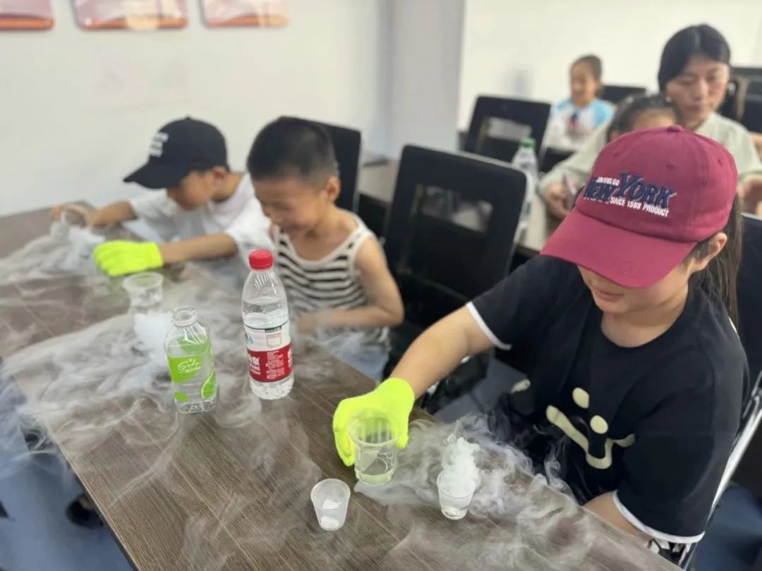 孩子們在老師和家長的指導(dǎo)下,孩子們完成了“干冰云霧”實驗,白煙在會場彌漫,仿佛置身在云霧繚繞的山林中,孩子們都很興奮,感受著干冰實驗帶來的神奇。