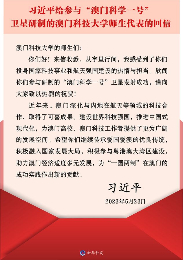 習近平在回信中說,從字里行間,我感受到了你們投身國家科技事業和航天強國建設的熱情與擔當。欣聞你們參與研制的“澳門科學一號”衛星發射成功,謹向大家致以熱烈的祝賀!