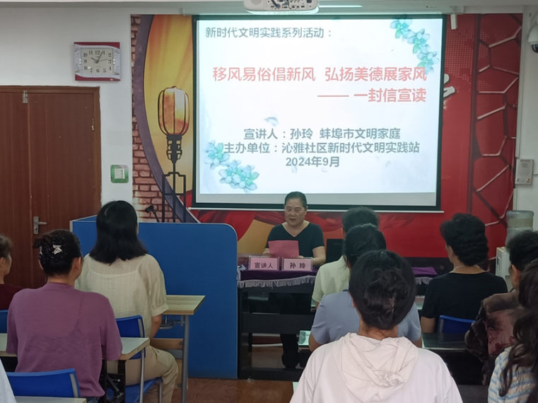 沁雅社區在新時代文明實踐站開展“移風易俗倡新風 弘揚美德展家風”——一封信宣讀活動。活動邀請蚌埠市文明家庭孫玲作為宣講人,通過宣讀移風易俗一封信,號召廣大居民建立科學、健康、文明的生活方式,宣傳家風美德,引導居民以實際行動破舊立新,凈化社會風氣,自覺做移風易俗的踐行者和推動者。(徐春楠)