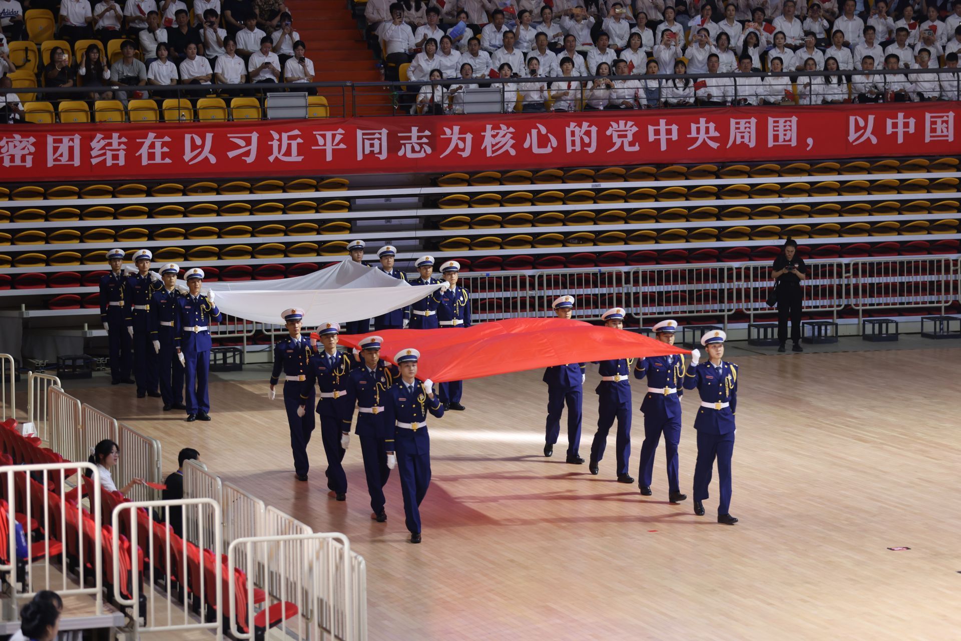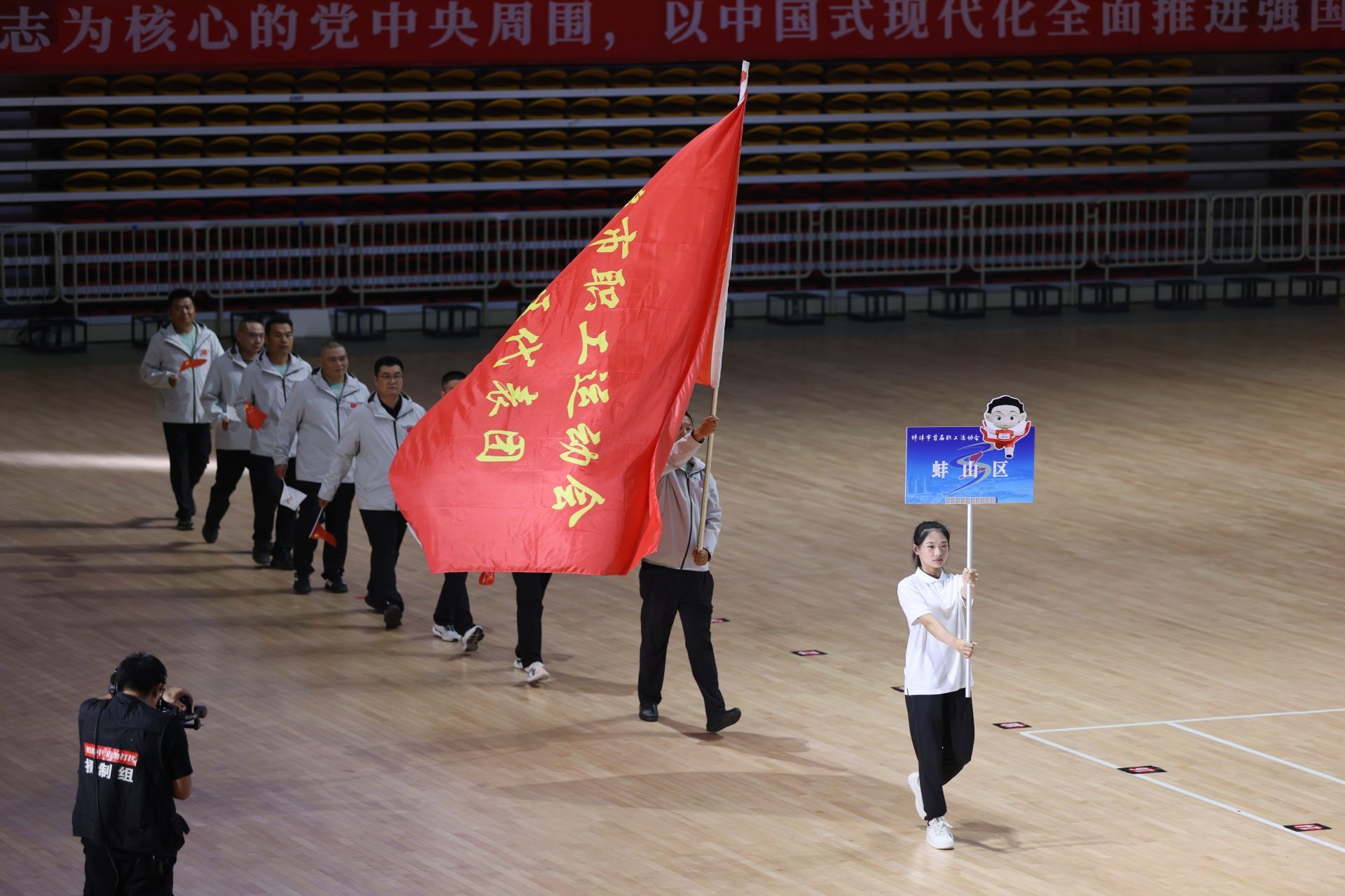 19時30分,蚌埠市首屆職工運(yùn)動會在隆重?zé)崃业姆諊姓介_始。8名威武挺拔的應(yīng)急救援人員護(hù)衛(wèi)著鮮艷奪目的五星紅旗步入會場,會旗護(hù)衛(wèi)隊(duì)緊隨其后。緊接著,裁判員代表團(tuán)和運(yùn)動員代表團(tuán)依次入場,充分展現(xiàn)了我市廣大職工昂揚(yáng)向上的精神風(fēng)貌。
