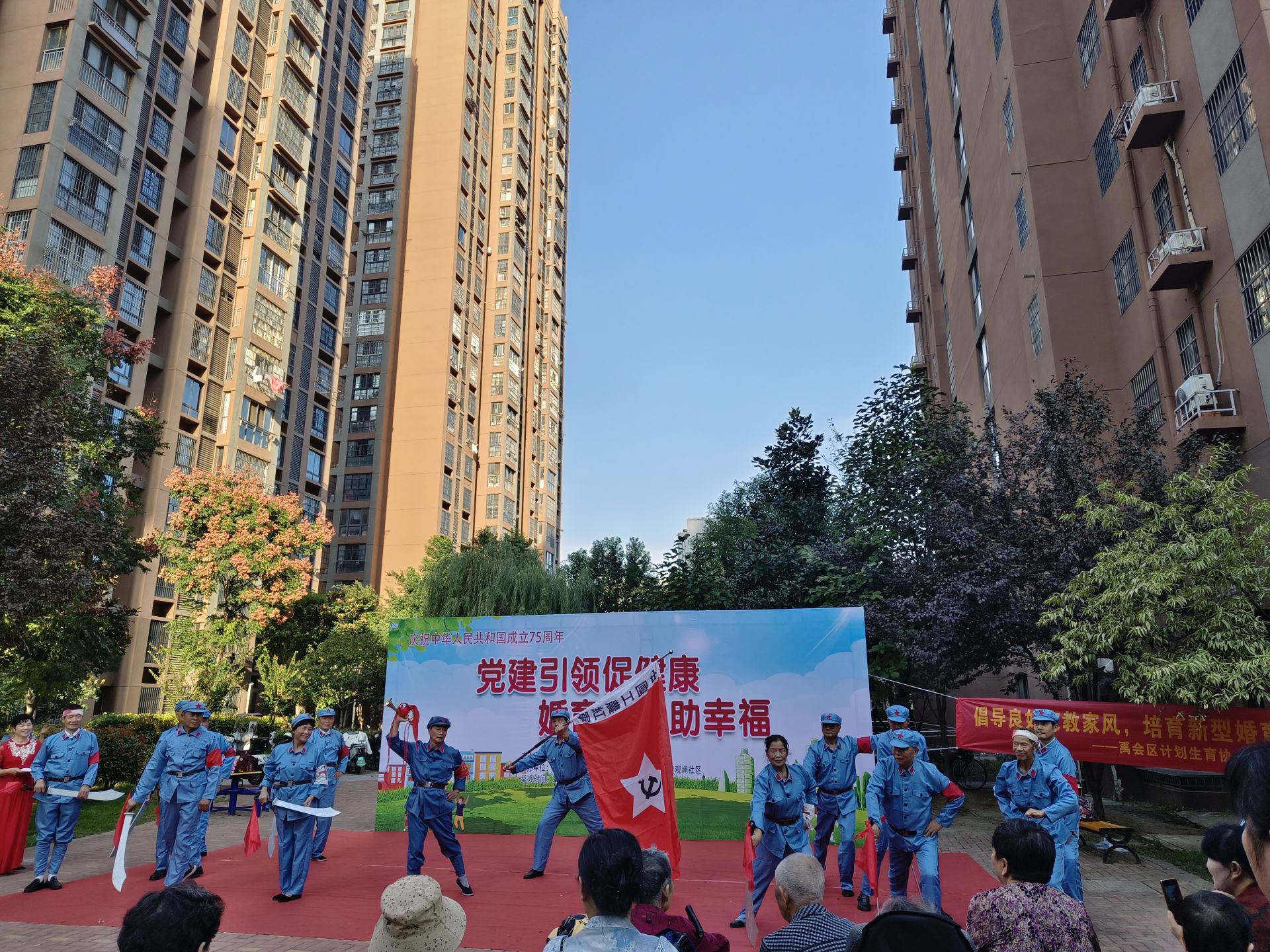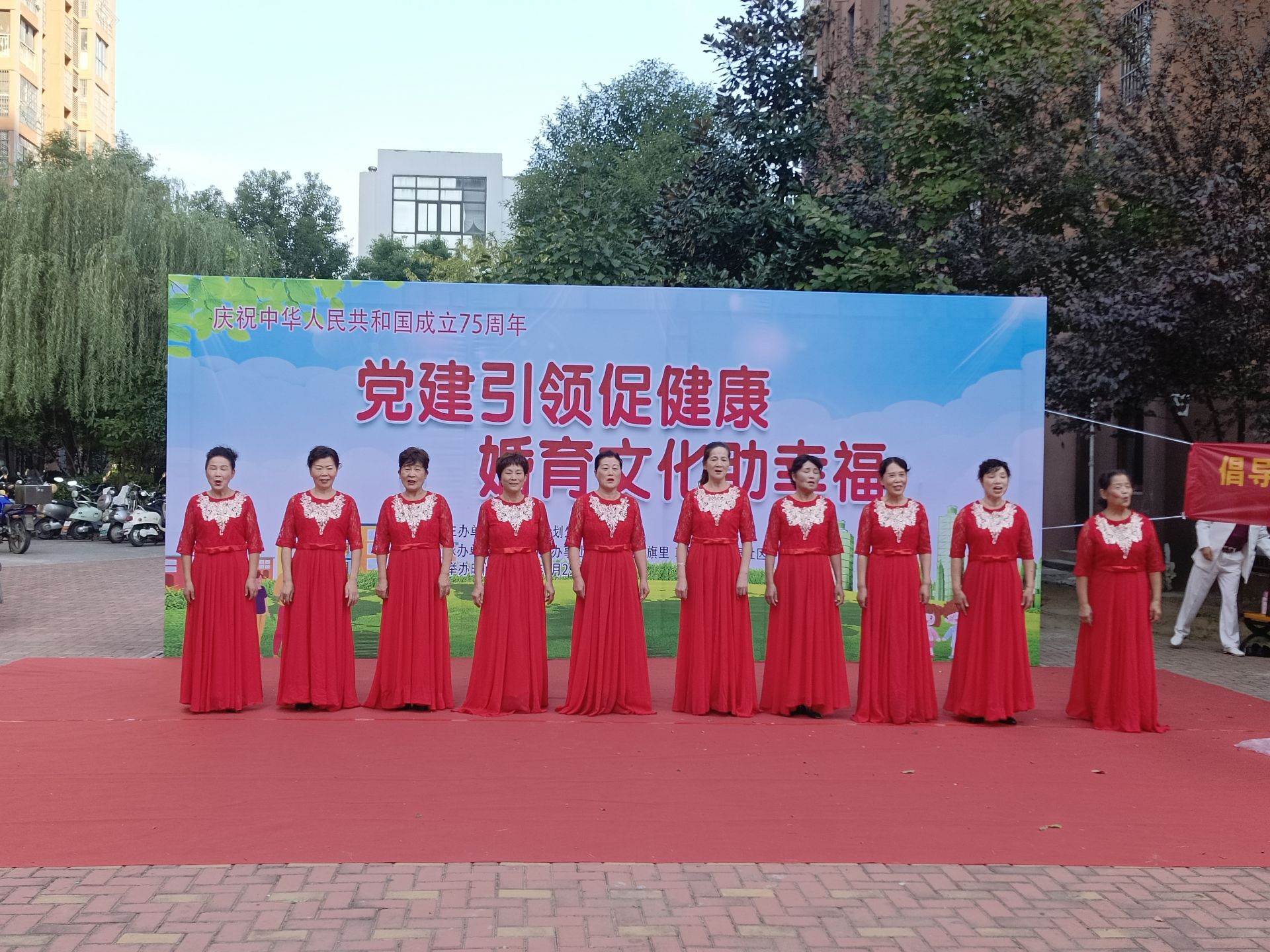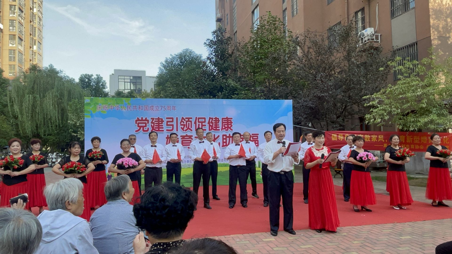 9月29日,朝陽街道聯合紅旗里社區在茗香金庭小區舉辦“黨建引領促健康,婚育文化助幸福”暨慶祝中華人民共和國成立75周年文藝匯演活動。本次活動邀請轄區居民群眾參加,不僅為居民們帶來了一場精彩紛呈的文化盛宴,更在歡聲笑語中加深了大家對祖國的熱愛與祝福。