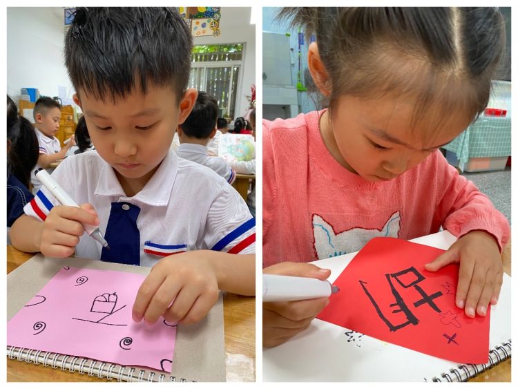 小小中國娃,濃濃愛國情。孩子們將祝福融入筆尖,為祖國媽媽繪制生日禮物!