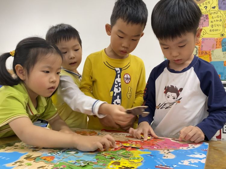 960萬平方公里對于孩子們來說是一個難以理解的概念,小伙伴們利用拼圖完成一幅完整的中國地圖,知道每一塊土地都是中國版圖里不可分割的一部分。