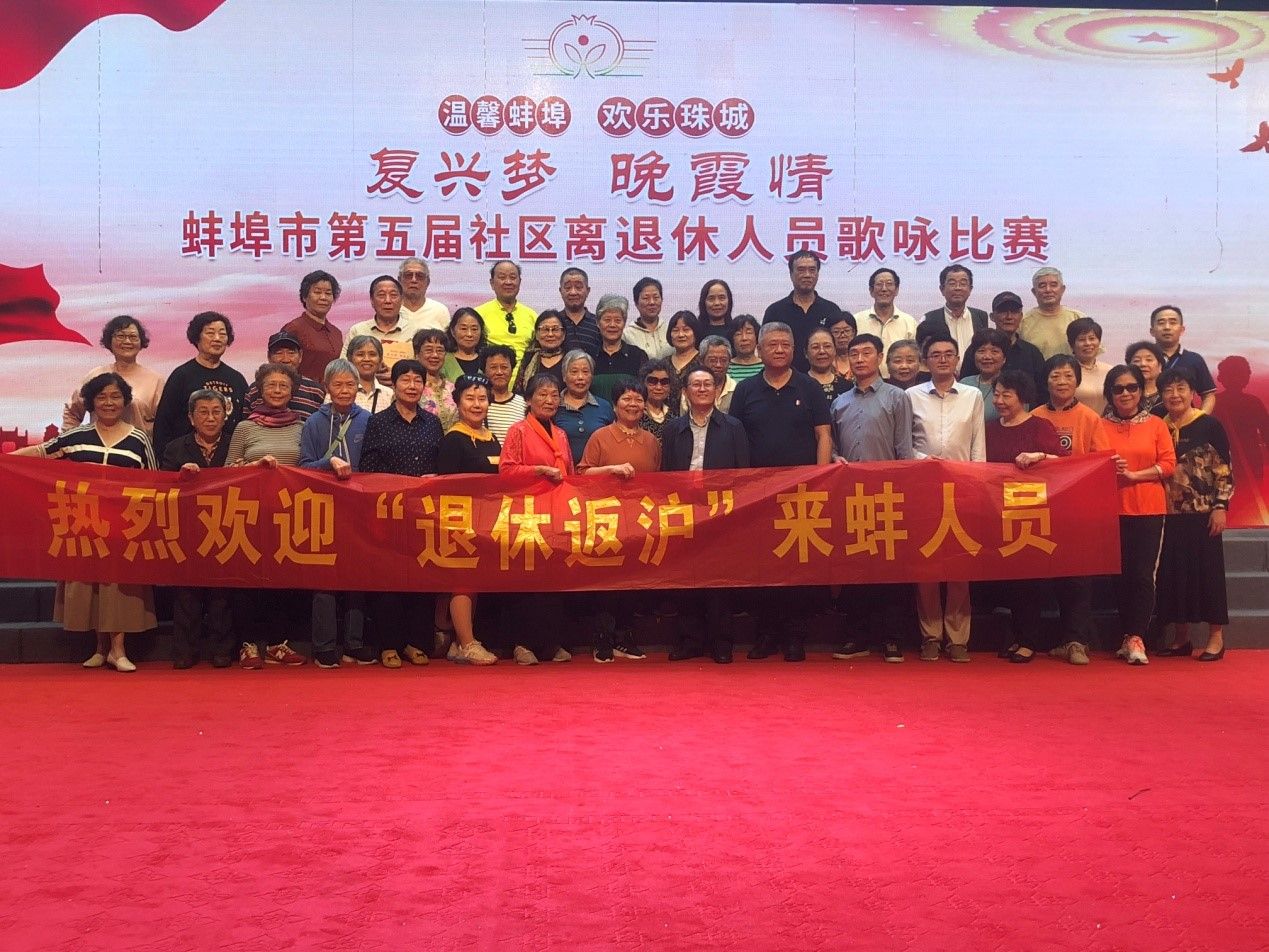 退休返滬人員觀看蚌埠市第五屆“復興夢 晚霞情”社區(qū)離退休人員歌詠比賽舞臺留影